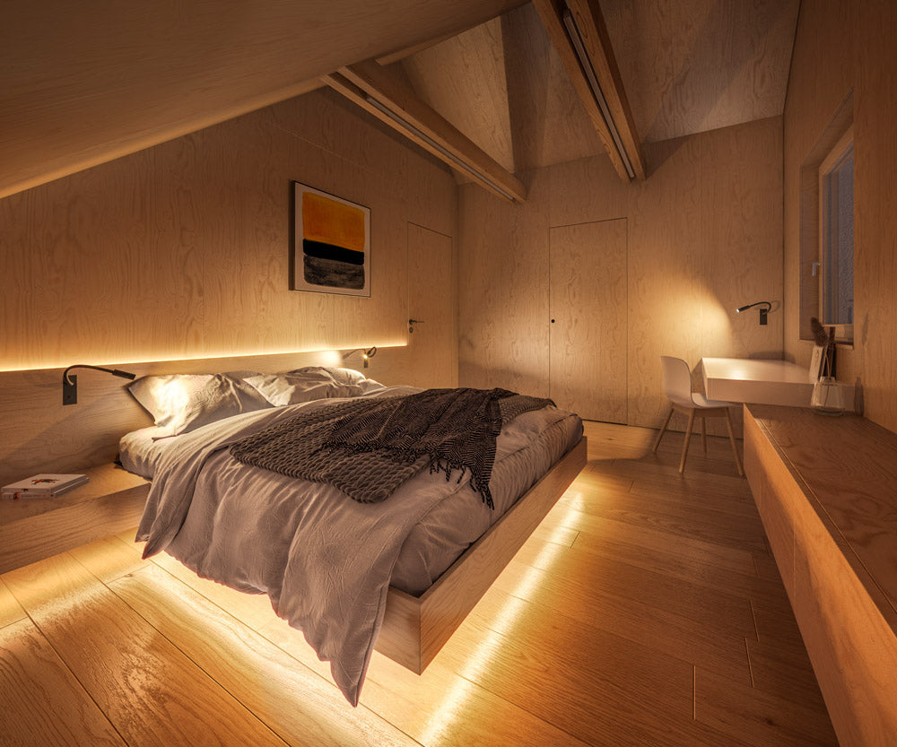 Kulkuvalona ja tunnelmallisena yksityiskohtana toimiva sängynalusvalaistus.