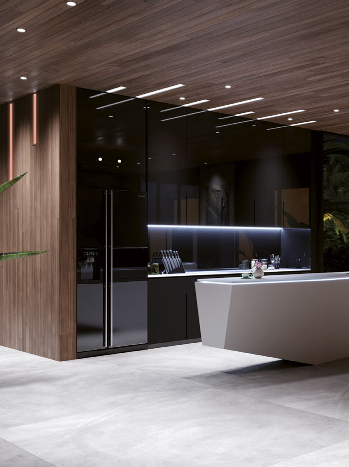 Tässä modernissa keittiössä on huikean tyylikäs uppoasennettu LED-nauhavalaistus. Uppoasennettavia LED-profiileita voi asentaa vaikka millaisiin kuvioihin ja luoda niillä jännittävän tilan modernilla otteella.