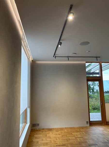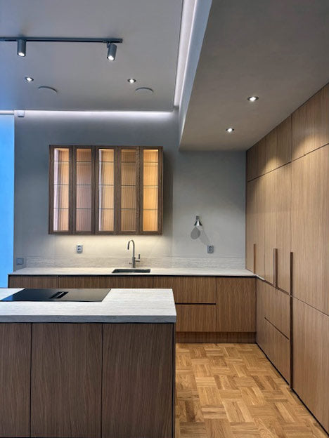 Tässä kodissa valaistusratkaisut yhdistävät hillittyä epäsuoraa valoa ja tarkasti kohdennettuja valaisimia, jotka korostavat materiaalien kauneutta ja arkkitehtonisia yksityiskohtia. Olohuoneessa kiskovalaisimet ja katon rajaan sijoitettu LED-valonauha luovat pehmeän, tasaisen yleisvalon, jota voi suunnata tarpeen mukaan. Keittiössä kattoon upotetut alasvalot tarjoavat kirkasta työskentelyvaloa, kun taas välitilan ja vitriinikaappien valaistus tuo lämpöä ja visuaalista syvyyttä. Myös yksityiskohtia, kuten laattaseinää, on korostettu kohdevalolla, mikä lisää tilan arkkitehtonista ilmettä.