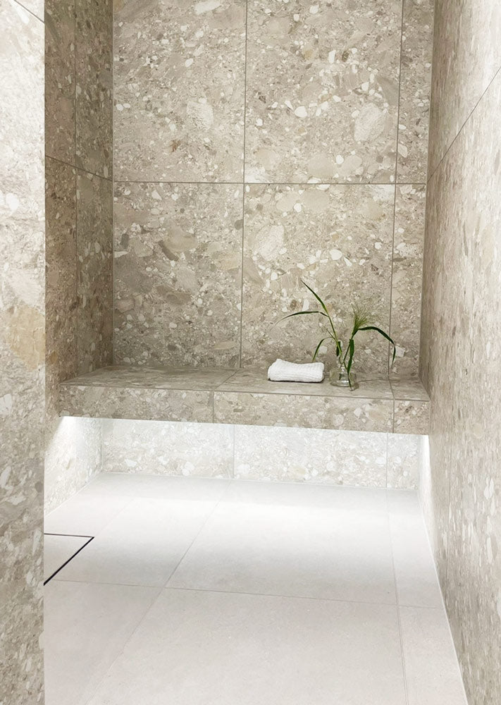 - Kylpyhuoneet: Valo piiloutuu rakenteisiin ja saa kaapistot ja peilit näyttämään leijuvilta. Pehmeä epäsuora valo tekee aamurutiineista miellyttävämpiä ja iltatoimista rentouttavia. Kylpyhuoneissa on käytetty 9,6W/m 24V CRI90 4000K NANO IP65 LED-valonauhaa sekä MINI8 LED-profiilia, SIIPI14-IN LED-profiilia peilikaapin päällä sekä saippuasyvennyksessä LAATTA-UPPO12 180 asteen LED-profiilia.