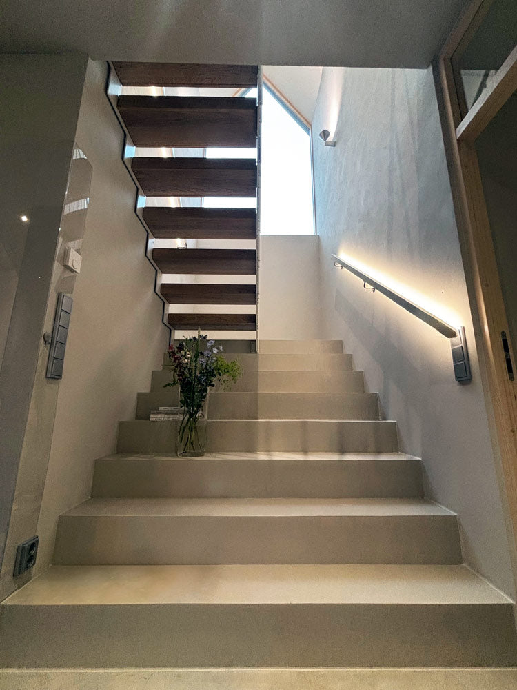 - Portaikon LED-valaistus: Epäsuorat LED-nauhat kaiteessa ja askelmien alla luovat tyylikkään, turvallisen kulkuvalaistuksen, joka toimii yhtä lailla käytännöllisenä kuin tunnelmallisena ratkaisuna. Portaikossa LED-valonauhana 9,6W/m 24V COB LED-valonauha sävyssä 4000K asennettuna MINI8 LED-profiiliin.