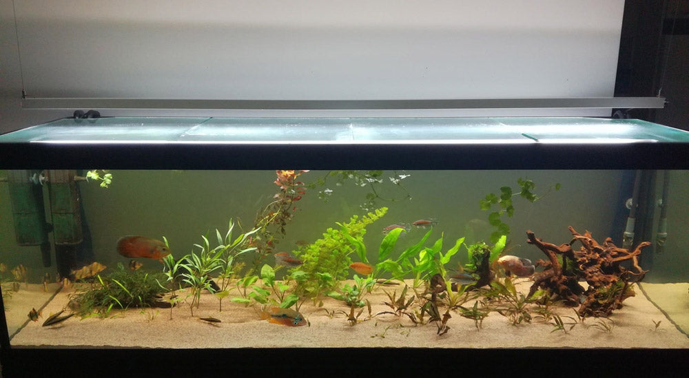 The aquarium lighting is implemented with efficient LED-light strip and a pendant lighting system. LED-profile.