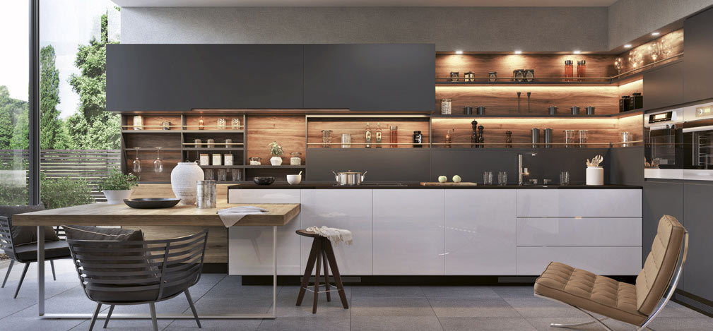 Open shelves gets lighting with a modern touch LED-with light strips and graceful recessed- or surface-mounted LED-profiles.